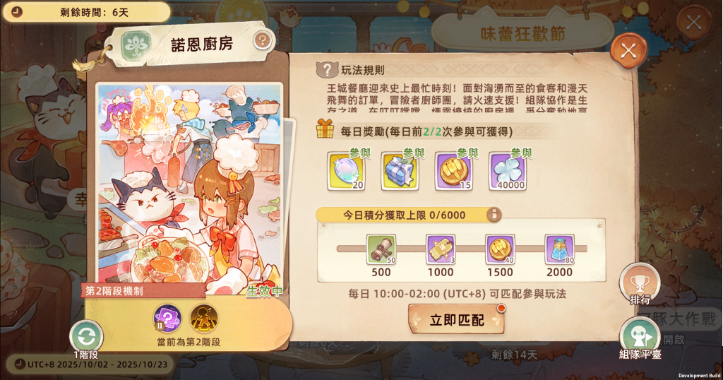 【諾恩廚房】則需要勇者組隊合作,根據條件要求對食材進行加工烹飪,在規定時間內提交餐點獲得積分,積分較高的一方可以獲得喵喵大表情、扭蛋幣、女神碎金等勝利獎勵。