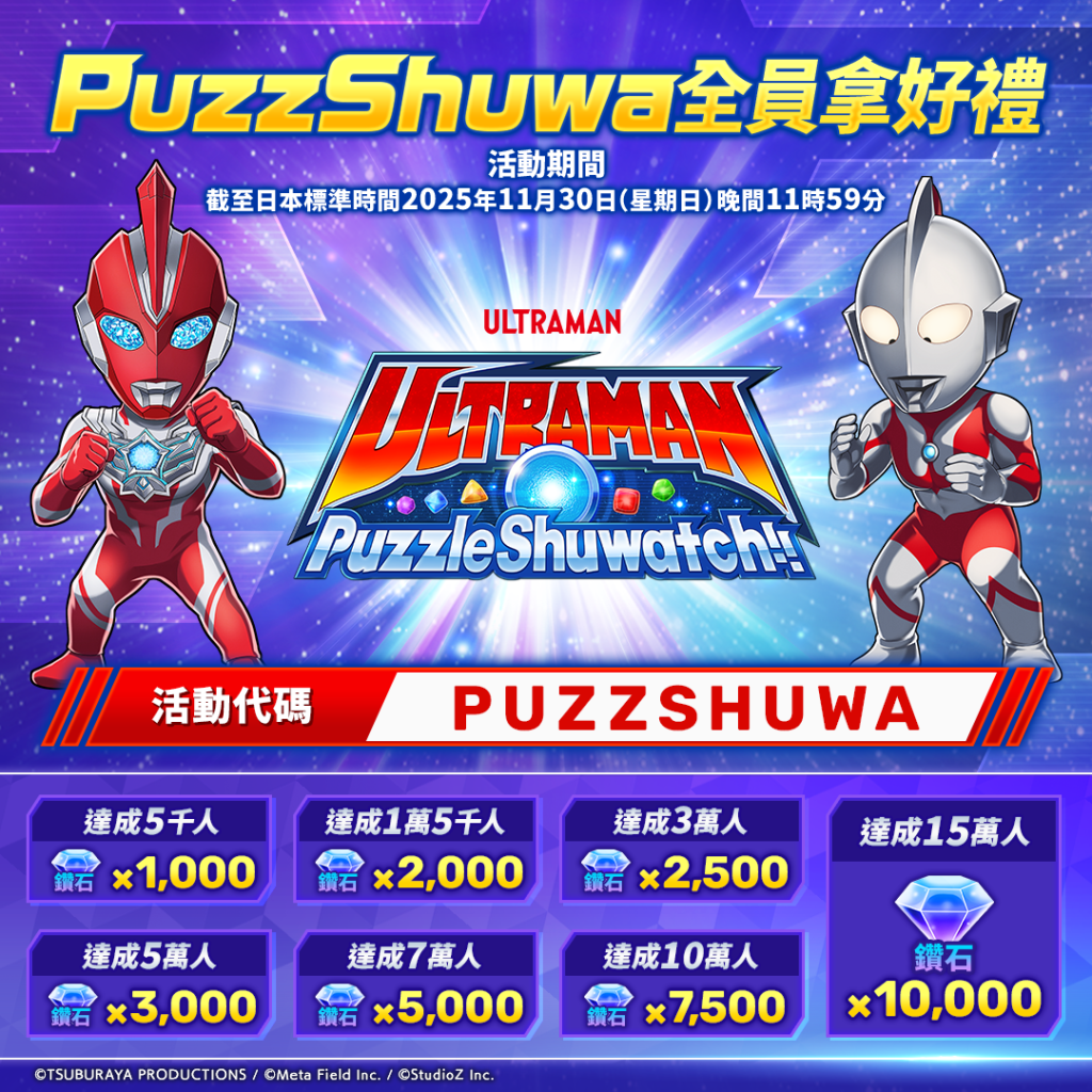 本活動為邀請型活動「PuzzShuwa全員拿好禮」。玩家只需在遊戲內專屬輸入畫面輸入活動代碼「PUZZSHUWA」,即可立即獲得鑽石 3,000 顆作為獎勵。此外,依據該代碼的總輸入次數,還將追加全體報酬——額外鑽石獎勵。活動進度與獎勵達成情況,將透過官方 X 帳號不定期公告。歡迎把握機會,邀請親朋好友一同進入《超人力霸王拼圖Shuwatch!!》的世界!