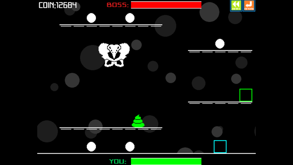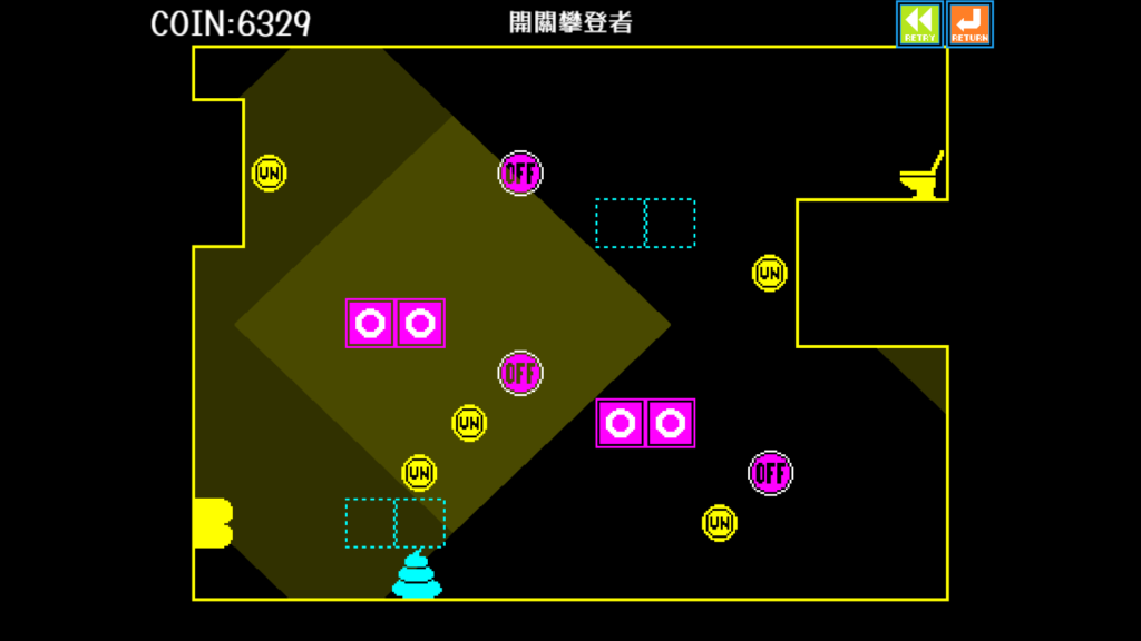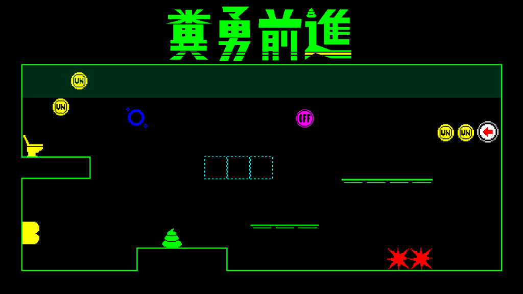 《糞勇前進》是在霓虹燈裝飾的世界中,透過跳躍將自動前進的「糞便」引導到目標馬桶的高難度2D動作遊戲。