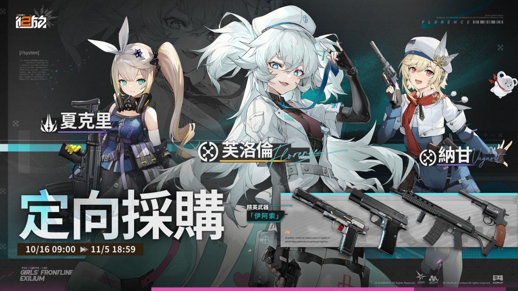 活動期間,在【定向採購】及【軍備提升】中,人形「芙洛倫」、「夏克里」、「納甘」及精英武器「伊阿索」的獲取機率限時提升。