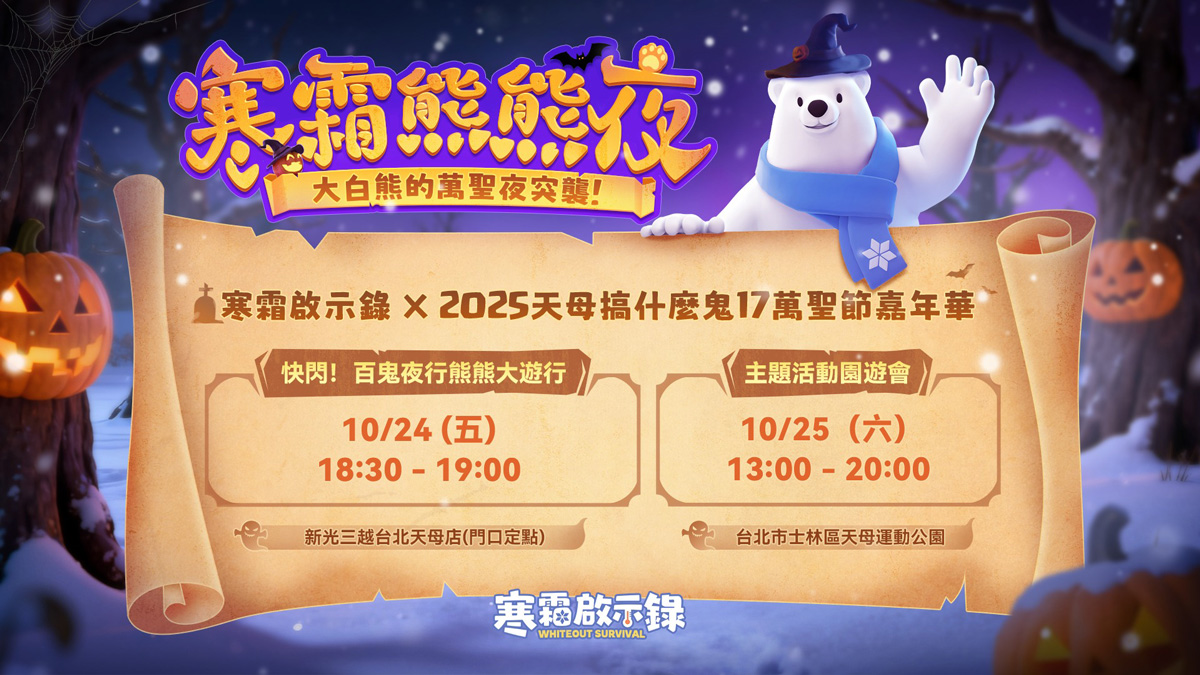 由 Century Games Pte. Ltd.推出、杰遊有限公司發行,全球超過 2 億人下載的冰雪末日生存策略手機遊戲《寒霜啟示錄》(Whiteout Survival)的大白熊將首度登場亮相,於10月24、25兩日,在「天母搞什麼鬼」17萬聖節嘉年華舉辦「寒霜熊熊夜」活動,玩家只要在指定地點捕捉到大白熊,就可獲得糖果與限量贈品!緊接萬聖節之後,大白熊還將前往電競嘉年華 WirForce 及新北歡樂耶誕城,在今年冬天好好的溫暖玩家!