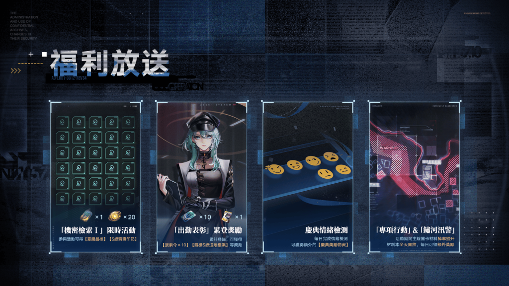 ■11/1-12/5登錄遊戲即可領取「免費月卡」。結合先前的夏日福利活動,於12/2前通關主線Re4-12即可領取指定「S級禁閉者自選*1」,三週年相關豐富獎勵活動,總計送出超過60抽及大量養成材料,新手更可領取超過110抽以上資源!