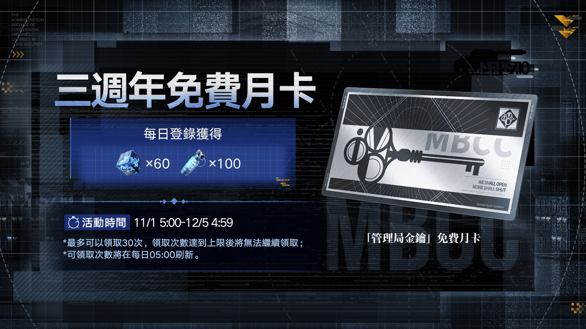 【管理局金鑰】三週年免費月卡(累計領取1800異方晶、3000體力)