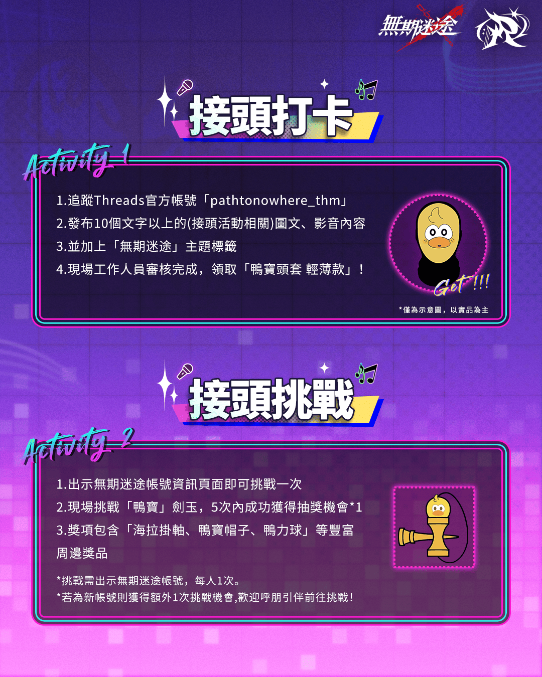 「上街頭 一起接上鴨頭吧!」線下音樂派對即將展開,本次邀請合作樂團「Ring誓約之聲」演唱10首無期迷途經典曲目,熱烈邀請局長們親臨現場,享受音樂饗宴,並打卡領到限定鴨寶頭套-輕薄款!