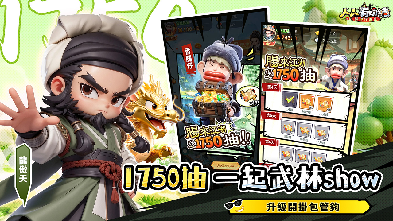 無厘頭武俠放置卡牌 RPG《人人有功練:腸仔江湖見》今日正式喺雙平台上線!一系列開服活動以及「大師兄」黃一飛出演嘅主題曲完整版影片活動亦都同步開放,下載即送1750抽,胸懷俠義夢想嘅你,即刻嚟同衆多經典武林大神一齊開啟訓住練功嘅江湖旅程!