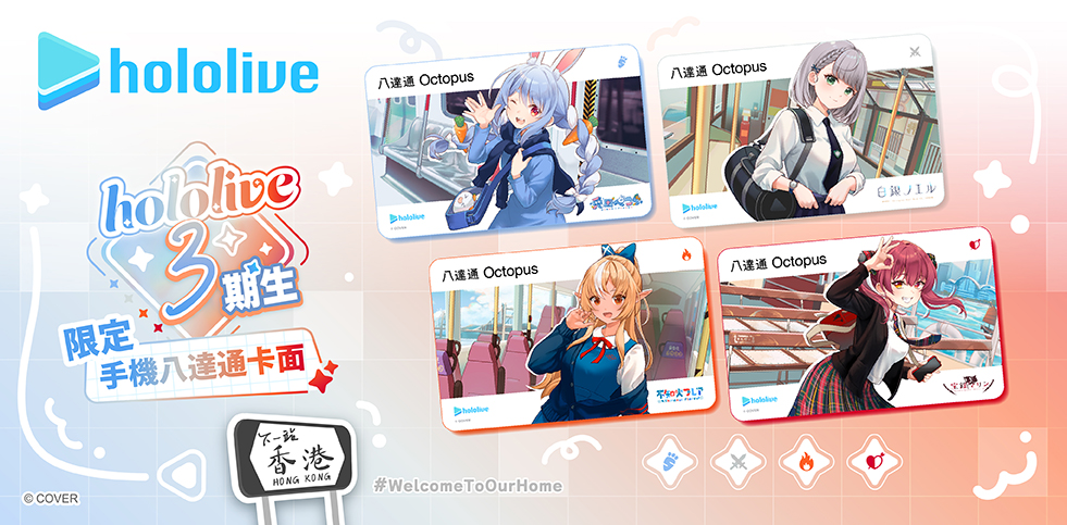 COVER Corporation 今日宣布了 hololive production 與八達通卡有限公司的全新合作,推出以 hololive 三期生成員——兔田佩克拉、不知火芙蕾雅、白銀諾艾爾、寶鐘瑪琳為主題的專屬手機八達通卡面。