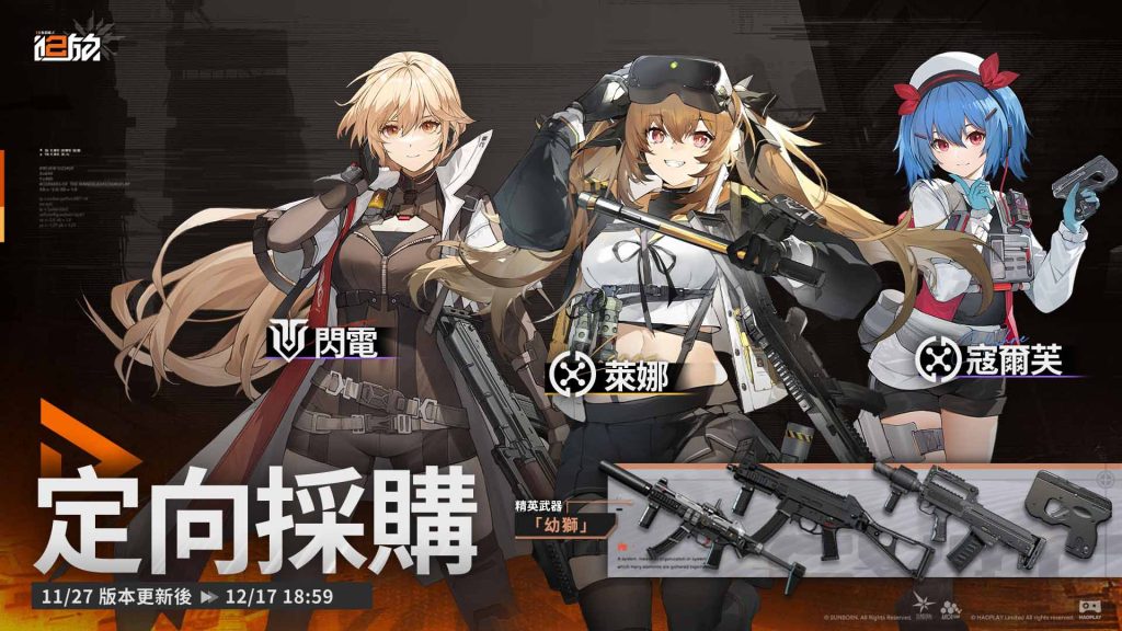 活動期間,在【定向採購】及【軍備提升】中,人形「萊娜」、「閃電」、「寇爾芙」及精英武器「幼獅」的獲取機率限時提升。