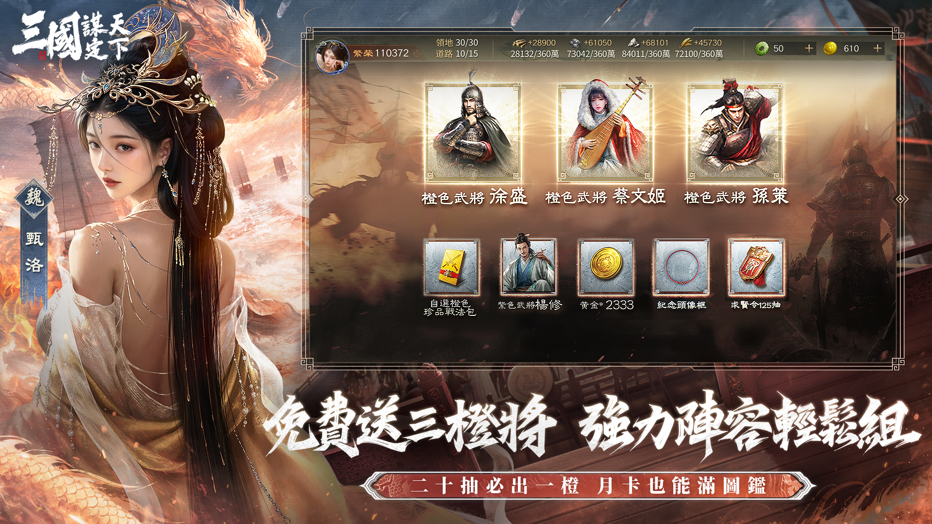 《三國:謀定天下》十分重視玩家回饋,推出多項極具誠意的福利機制,包括 20 抽必出橙卡、免費贈送三橙將,以及透過活動獲得的大量求賢令與黃金等資源,讓主公們不需承受養成壓力,就能輕鬆推進開荒進度,專注享受策略對戰的核心樂趣。