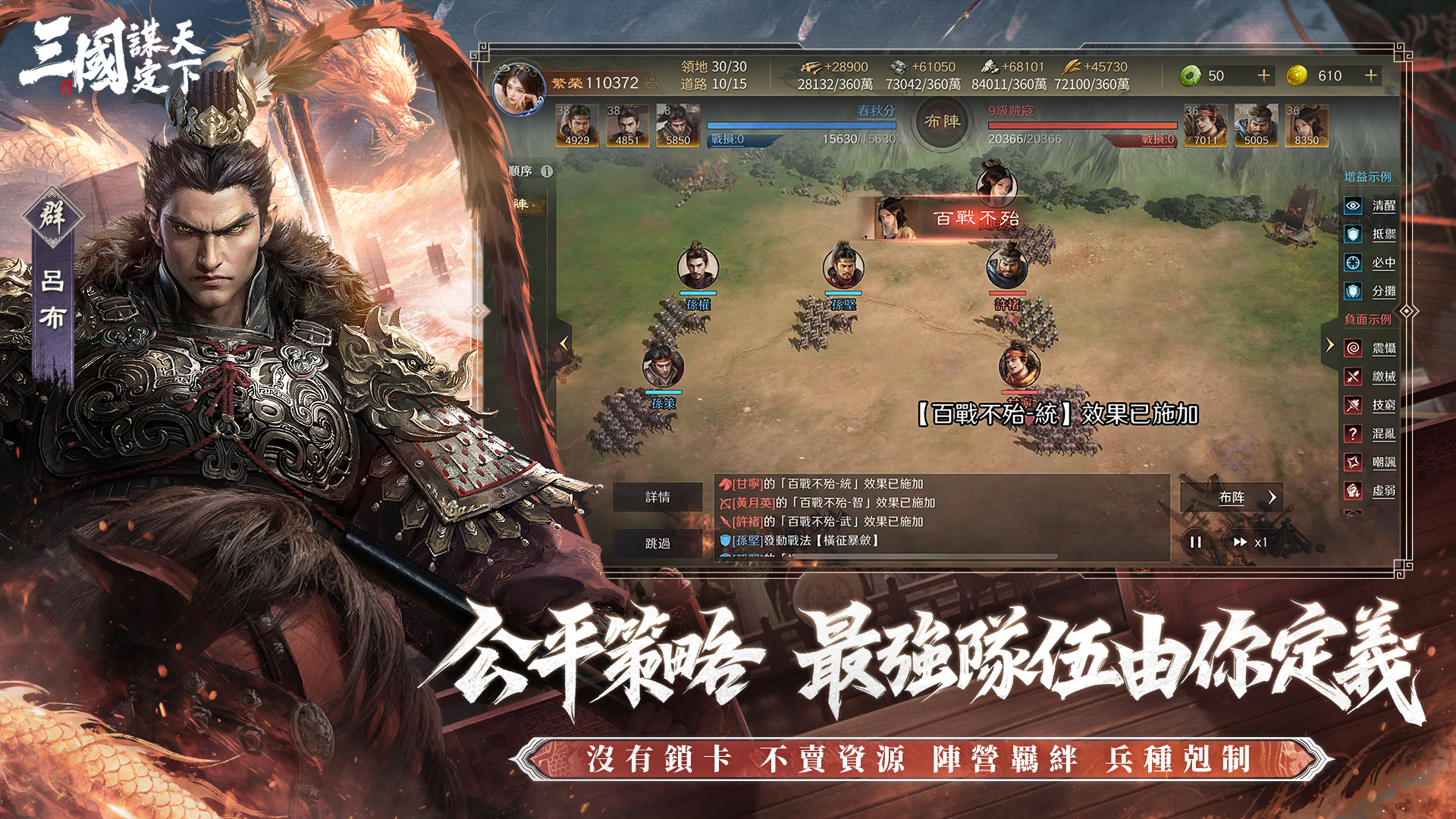 《三國:謀定天下》秉持不鎖卡、不賣資源、強調公平競技的核心理念,讓所有主公在同一戰場上以策略實力一較高下。遊戲中特別注重各陣營武將間的 剋制與平衡設計,並透過韜略、列傳羈絆、戰法組合等多個系統,讓主公能打造出千變萬化的戰術思路,玩出屬於自己的謀略風格。