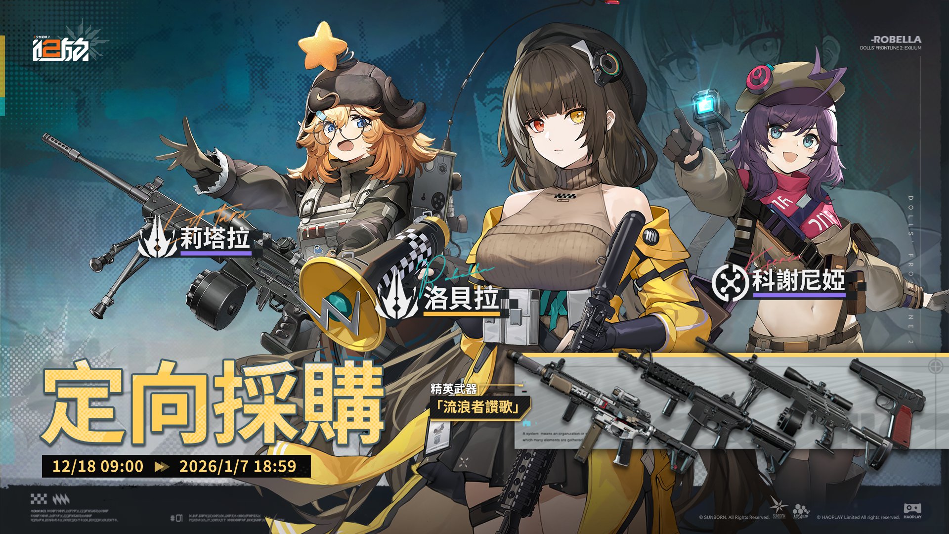 活動期間,在【定向採購】及【軍備提升】中,人形「洛貝拉」、「莉塔拉」、「科謝尼婭」及精英武器「流浪者讚歌」的獲取機率限時提升。