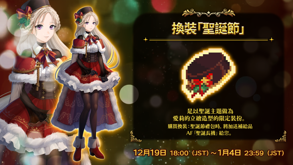活動期間內,遊戲主角之一的「愛莉」將可變更為季節限定服裝。只要購買包含此功能的「換裝:愛莉(聖誕節)禮包」,即可解鎖換裝功能。想看看不同魅力的愛莉,千萬不能錯過喔!