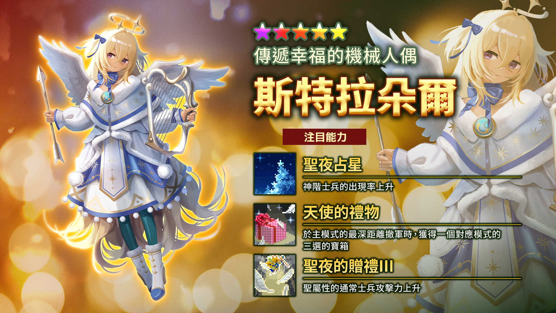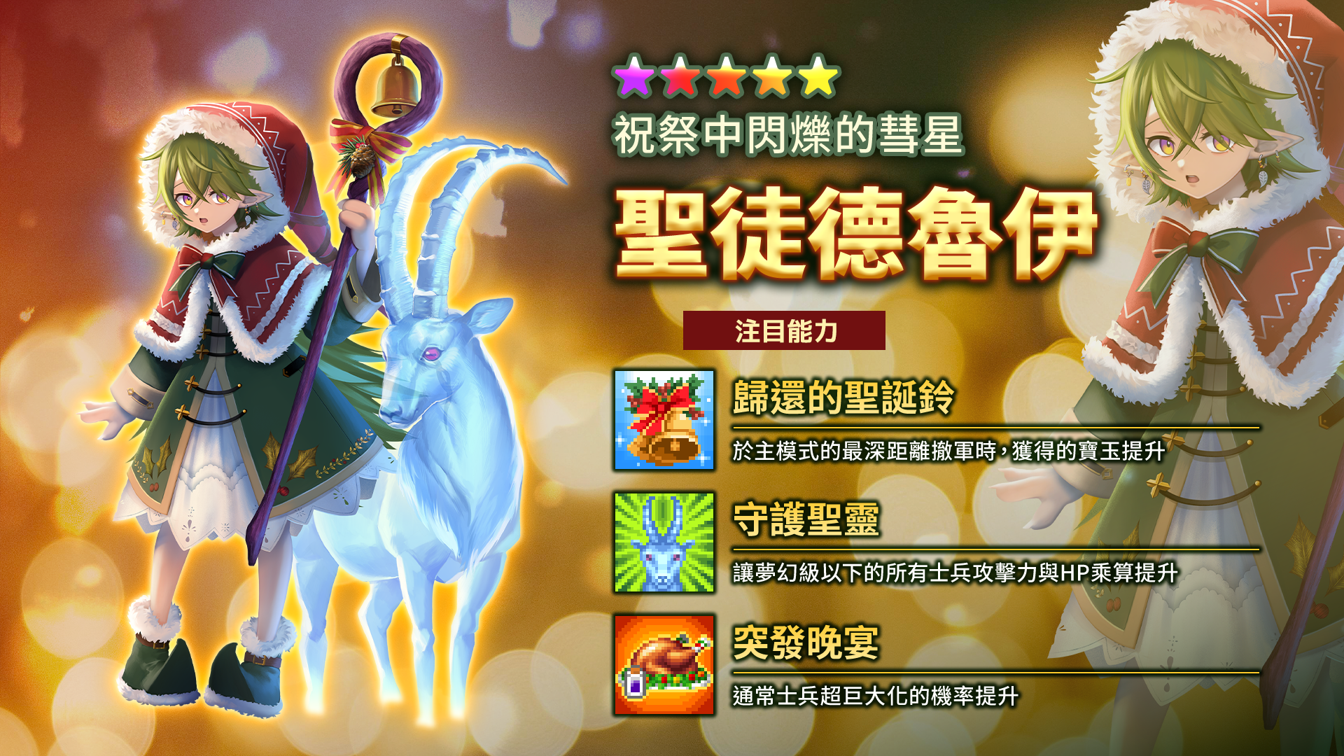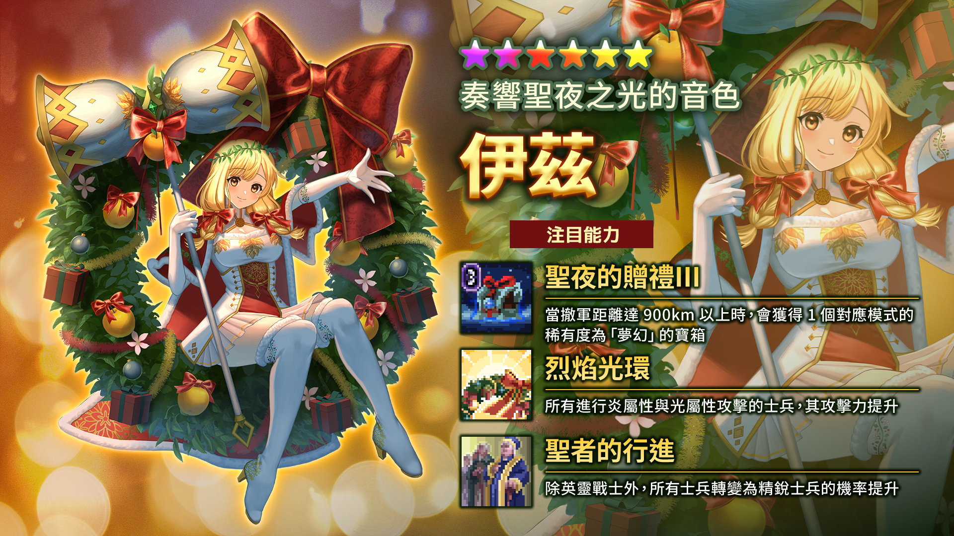 遊戲中大家所熟悉的女神「【奏響聖夜之光的音色】伊茲」將以全新技能「聖夜的贈禮Ⅲ」登場!能在撤軍時獲得夢幻寶箱,更是首位擁有多屬性能力的英靈戰士,為此次轉蛋唯一的★6角色。而德魯伊的新姿態「【祝祭中閃爍的彗星】聖徒德魯伊」則擁有能提升撤軍報酬的能力「歸還的聖誕鈴」,並將搭配嶄新的攻擊動畫。而再度登場的艾朵爾,則換上「【傳遞幸福的機械人偶】斯特拉朵爾」造型,具備提升神級兵士出現率的能力,在戰鬥中展現卓越的綜合戰力。最後,全新登場的火屬性射手「【聖火的贈予者】流星聖炎射手」則具備屬性強化與攻擊範圍提升的能力,將能在火屬性地下城中大放異彩。