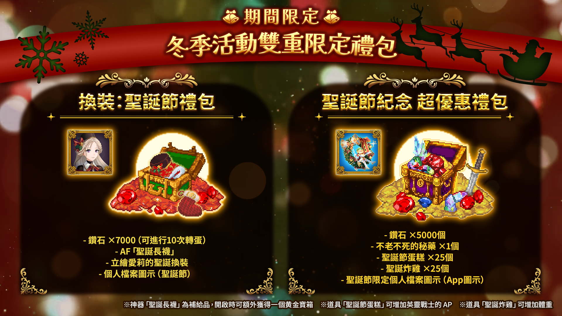 本次活動推出兩種期間限定禮包:「換裝:愛莉(聖誕節)禮包」內含愛莉聖誕服裝,以及可提升每日補給的限定神器「聖誕長襪」等。「聖誕節紀念 超優惠禮包」則內含活動限定道具「聖誕節蛋糕」、「聖誕烤雞」等豐富內容。兩款禮包皆附贈限定的個人檔案圖示,歡迎大家把握機會入手!