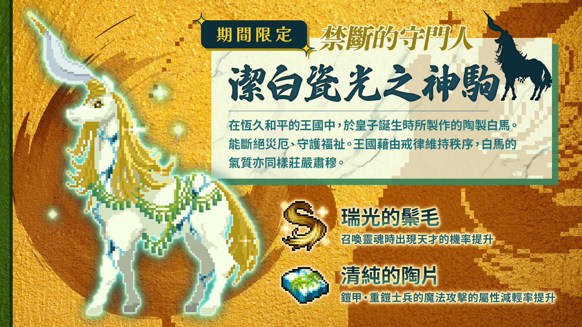 活動期間登入遊戲,即可獲得鑽石與季節限定道具等各種獎勵。「聖誕節蛋糕」可提升英靈戰士的能力點數(AP)、「聖誕烤雞」則可增加體重,作為強化道具使用。此外,12月底更新將實裝年末例行的期間限定Boss——「禁斷的守門人」。今年的新Boss將以生肖為主題、姿態美麗的馬型魔物「潔白瓷光之神駒」,玩家有機會獲得各種稀有限定神器!
