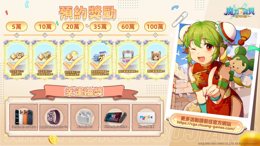 除人人可得的預註冊達標獎勵外,官方同步推出網頁限定抽獎活動。玩家只要完成預註冊即可取得抽獎資格,獎項包含 iPhone 17 Pro Max、MyCard點數及遊戲內限定獎勵。官方也提醒玩家留意活動頁公告與截止資訊,以免錯過參與資格。