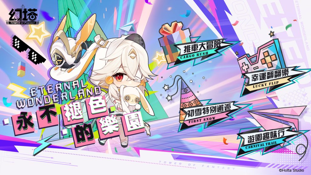 圖說:正式服5.6版本主題活動-永不褪色的樂園將於2026/1/1開啟,授權者參與活動並完成任務即可獲得時裝-卡丁謎、載具-魔仙百寶駒等豐富虛寶獎勵。授權者趕快登入《幻塔》一起迎接2026年,共渡美好元旦吧!