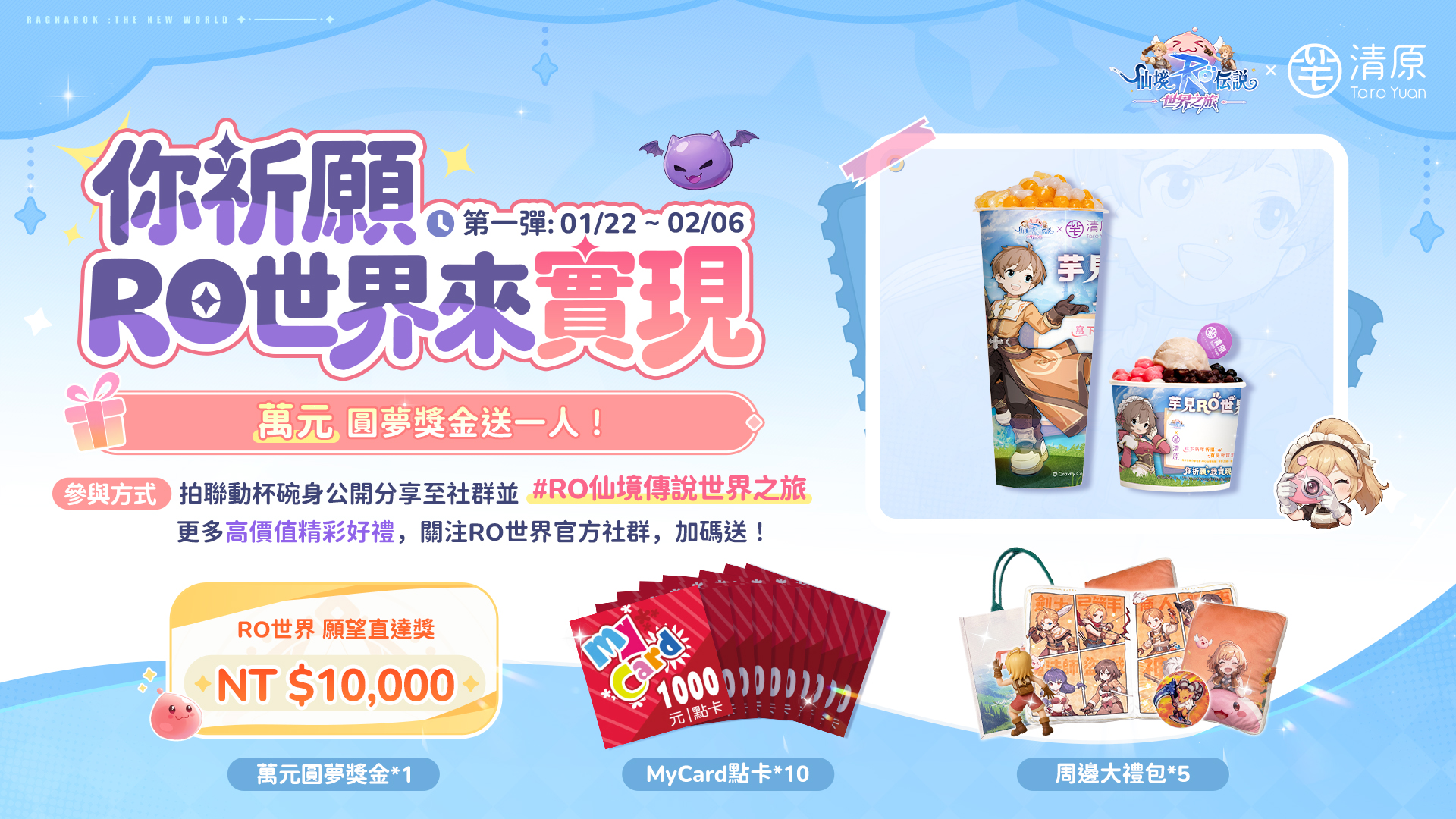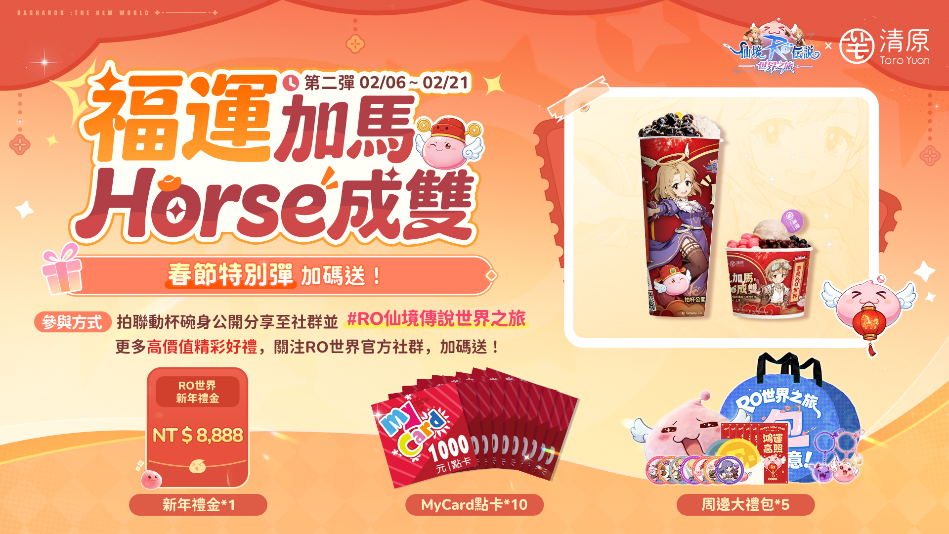 活動期間,冒險者們可於清原芋圓全台任一門市或外送平台買一杯喜歡的飲品,拍攝聯動杯身或碗身,寫下新春願望,並將照片公開分享至個人社群平台,即可參與「全民按讚祈願獎池」活動。活動將依據社群互動的點讚數解鎖獎池金額,你的每一個讚,都會讓獎池變得更豐厚!不僅願望有望成真,《RO仙境傳說:世界之旅》還準備了高價值MyCard點卡與遊戲獨家周邊,為你的冒險加碼祝福!