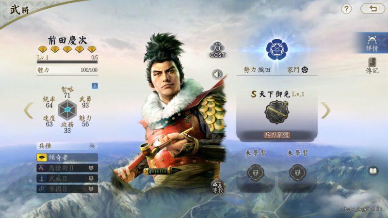 作為隊伍大將時,功能性豐富的奇人前田慶次,自帶戰法「天下御免」可在普通攻擊後造成額外兵刃傷害,若命中敵方大將,可使其陷入混亂;若敵方大將已混亂,則可偷取其主屬性併疊加,持續削弱對手核心。