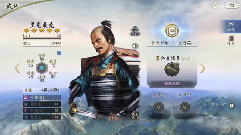 低統御需求的開荒好手里見義堯,他的自帶戰法爲「仁者懷勇」,普攻後能對敵軍造成謀略傷害,並有高機率使一名友軍聯動攻擊同一目標。