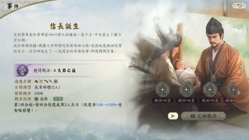 消耗特定「武將心得」,即可兌換相關歷史事件戰法,爲隊伍搭配帶來全新的思路和戰術補充。例如:事件「信長誕生」的戰法「大器之蘊」,從第五回合起,可以提供穩定的群體治療,建議搭配偏向防禦的隊伍。