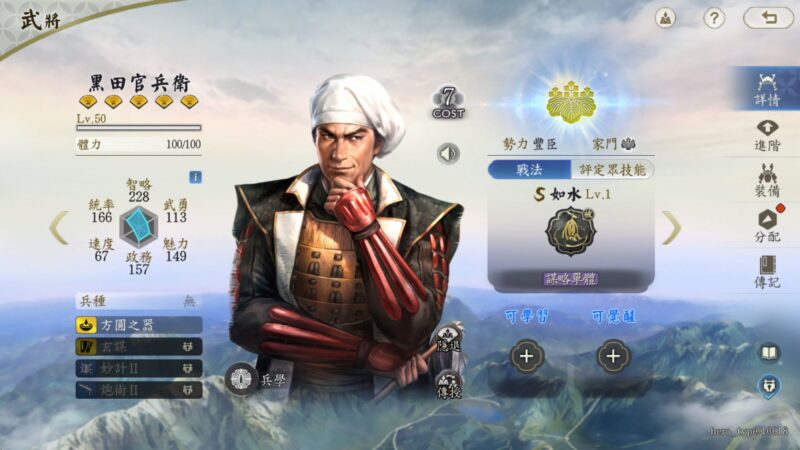 爲秀吉統一天下做出重要貢獻的黑田官兵衛,是擅長謀略輸出的核心智將。其自帶戰法「如水」能在每次行動前和首次受治療後機率獲得可疊加的「奇謀」狀態,並有機率對敵軍單體造成謀略傷害。