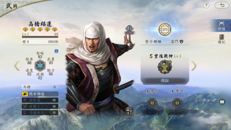 與立花道雪齊名的猛將高橋紹運,定位爲靈活的武將。自帶戰法「豐後戰神」使其在戰鬥中獲得洞察狀態,並根據自身最高屬性獲得相應增益。