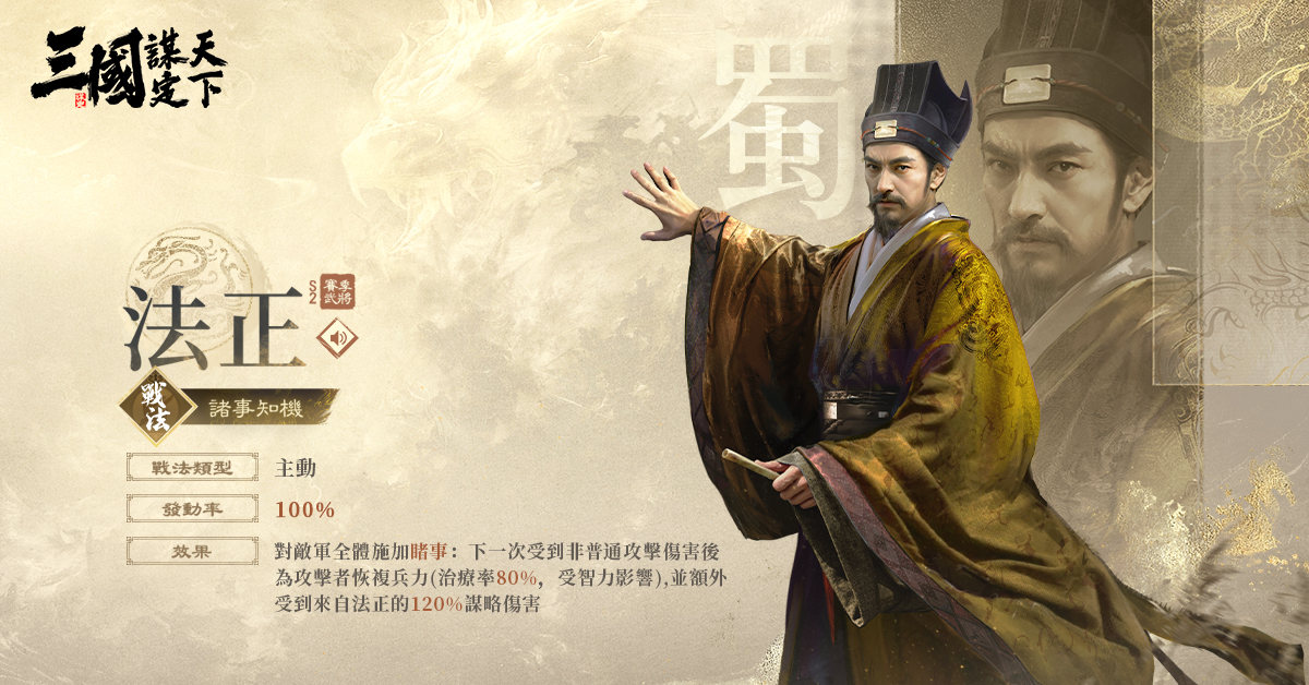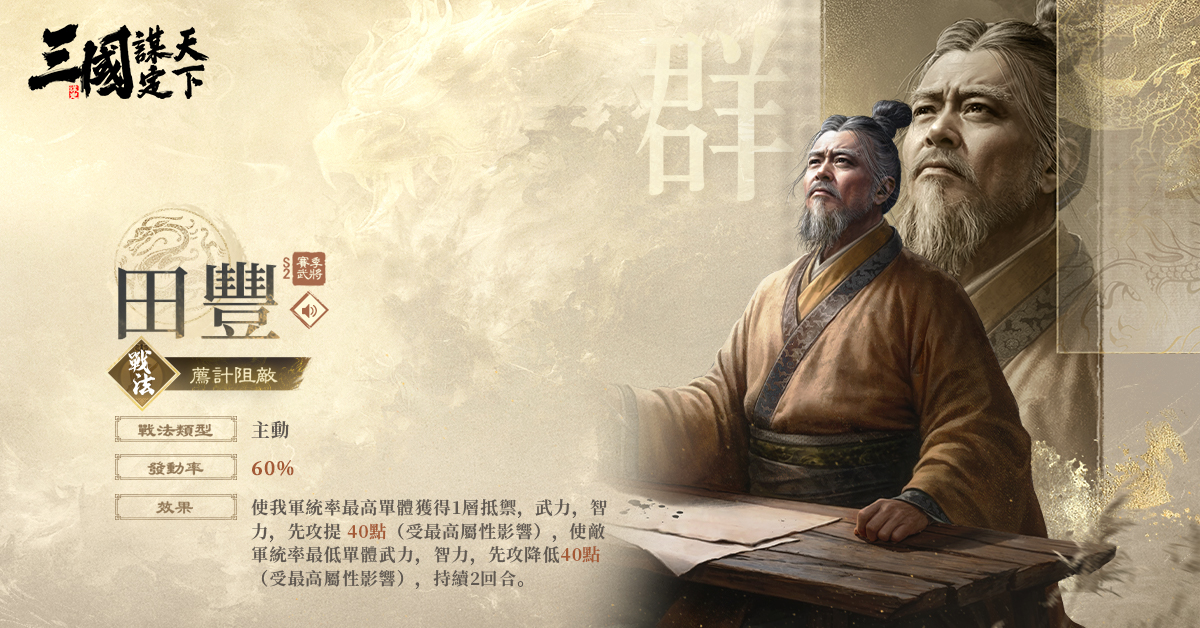 武將介紹:輸出與輔助兼具的武將。以『反間計』聞名的「毒士」,冷酷果斷、機智狡詐。曹魏的開國功臣之一。