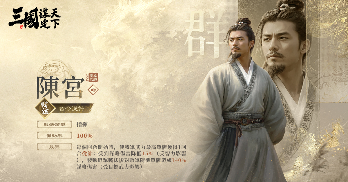 武將介紹:輔助型武將。呂布帳下的首席謀臣。足智多謀、剛正而有氣節。白門樓之戰中被俘後慷慨赴死,大義凜然。