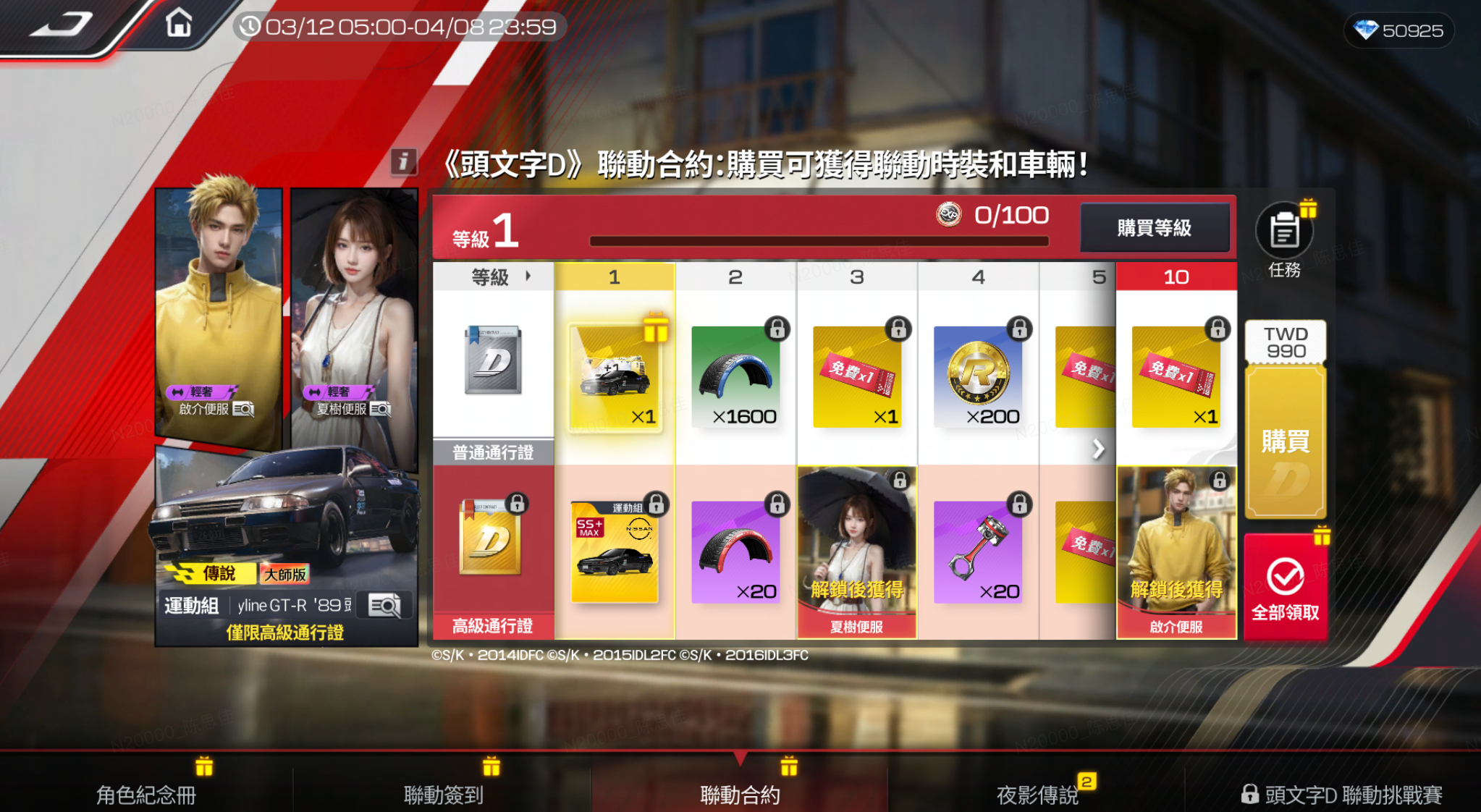 另外,活動期間還有聯動賽季合約,透過提升合約等級,將可獲得《頭文字D》角色藤原拓海、高橋啟介與茂木夏樹的專屬服裝,搭配特殊角色語音包與聊天氣泡,達成人車合一的最高境界。