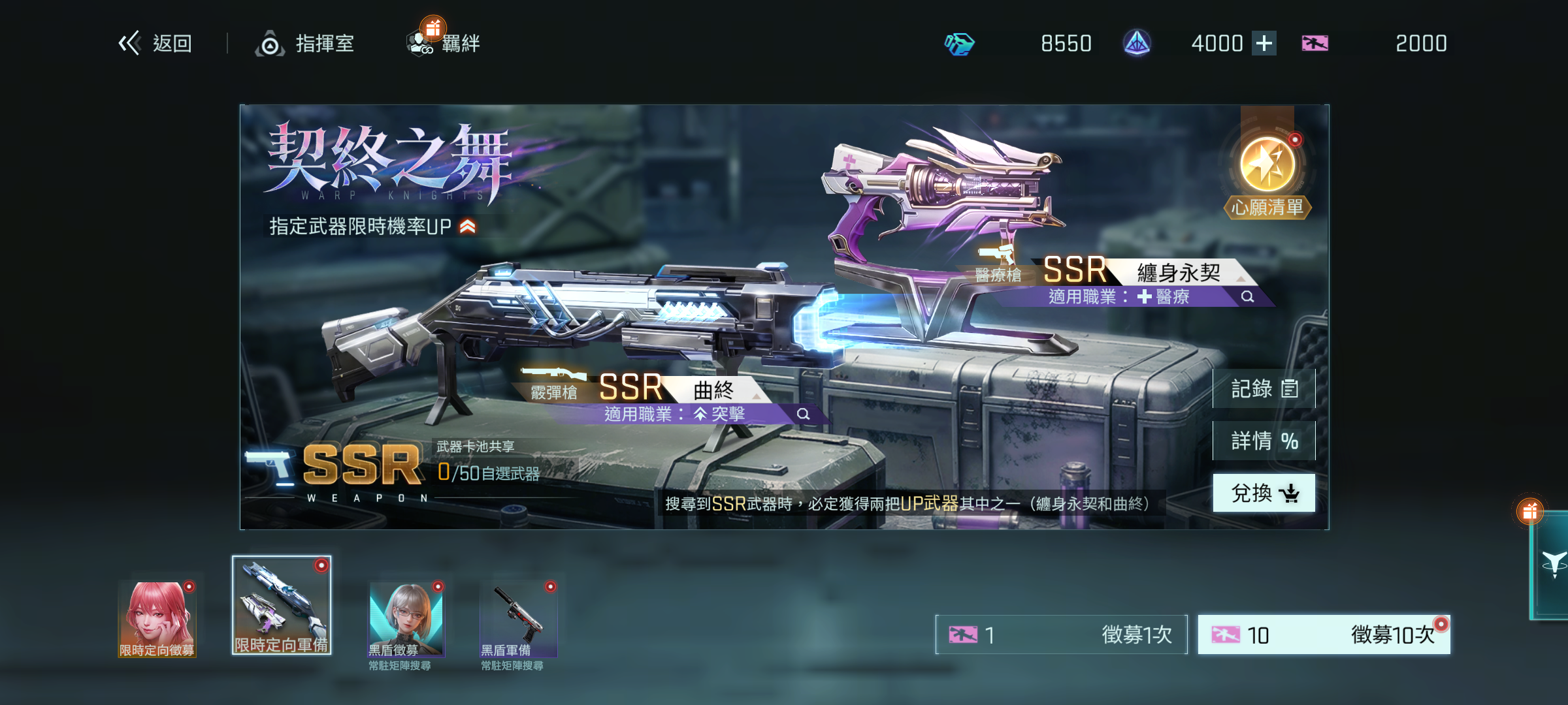 活動說明:活動期間,前往「黑盾徵募- 限時定向軍備」,搜尋到SSR武器時,必定獲得「曲終」、「纏身永契」兩把UP武器其中之一。