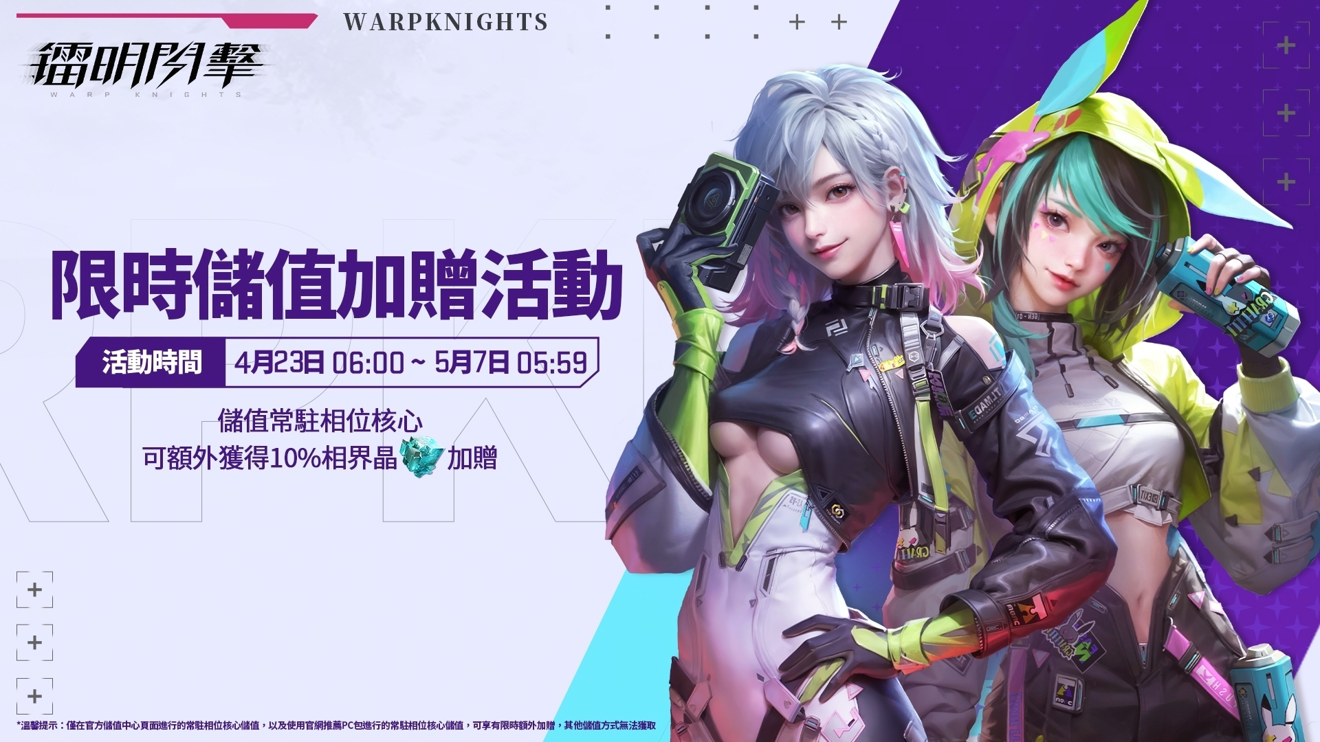 目前“冷臉瘋心”的貝拉和“芭蕾殺戮”的機械姬塔尼婭都在遊戲內正式開放獲取,玩家可前往遊戲內解鎖。與貝菈、塔尼婭並肩作戰,體驗更多角色專屬劇情與互動樂趣,感受不一樣的戰場反差魅力!官方更是同步開啟官網限時儲值加碼活動。活動期間於官網購買常駐相位核心,除了原本 5% 相界晶回饋,再加碼額外 5% 相界晶,總回饋直接拉滿到10%。美美的角色不僅療癒你心情,還幫你荷包直接回血,絕對不能錯過!更多關於《鐳明閃擊》的遊戲資訊和福利活動,敬請關注官方網站和官方粉絲專頁。希望永續,為世界而戰,一起對抗無盡的末日吧!