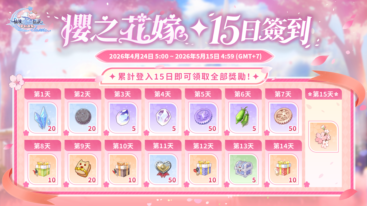 完成系列活動並累積 15 日簽到,即可獲得「櫻花頭飾」等限定造型,展現專屬浪漫。